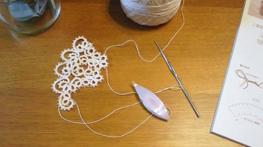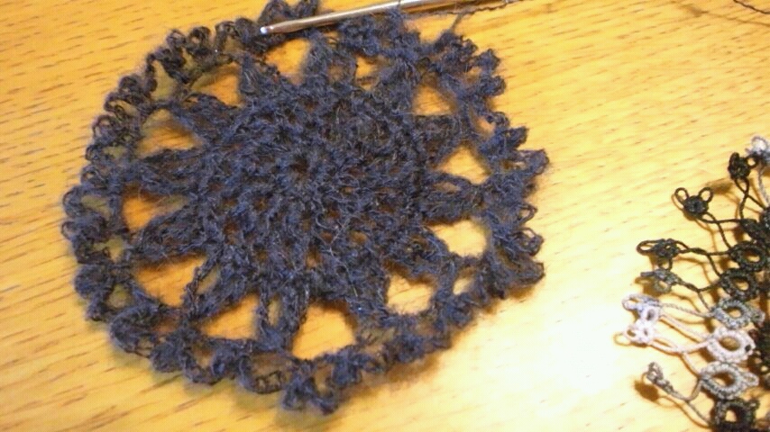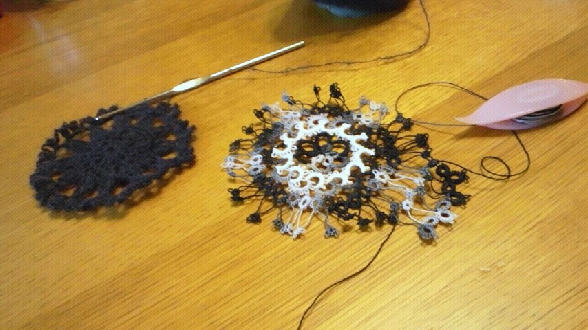 モヘア糸&かぎ針で編んでみた物と、レース糸&タティングで編んでるドイリー。