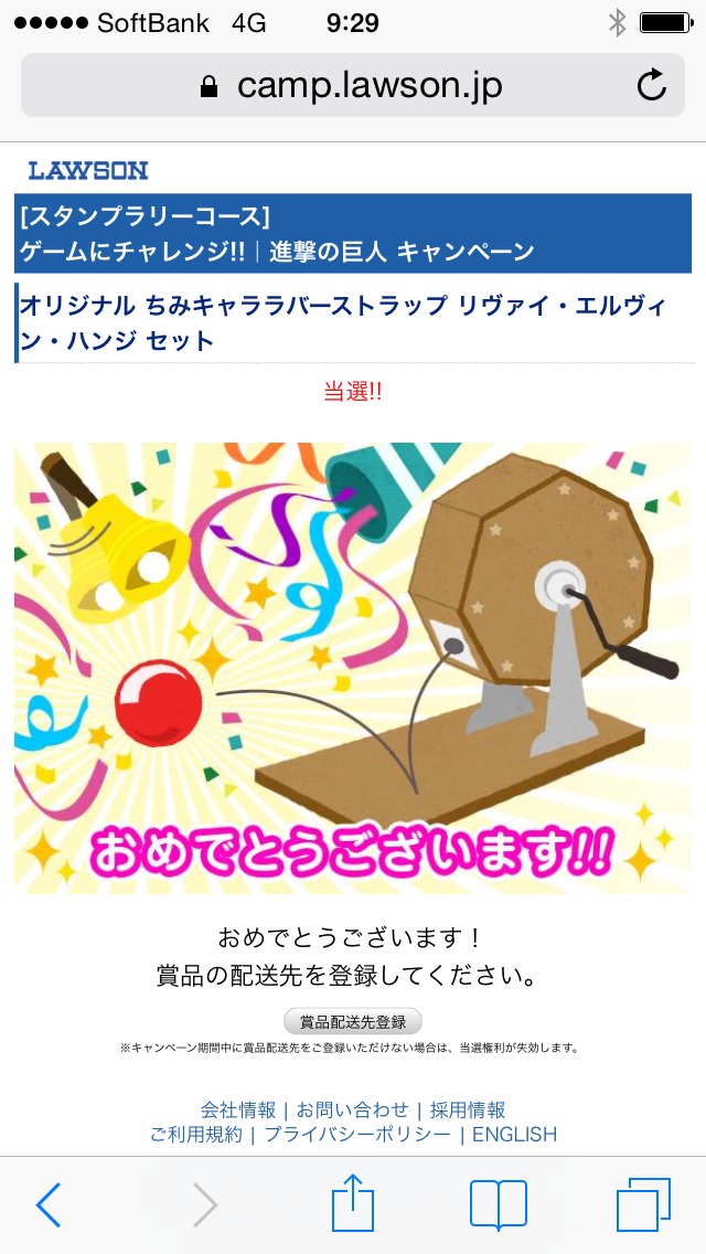 ローソンの進撃キャンペーンのからあげクン5個目のラバーストラップセット、当たりました\(//∇//)\