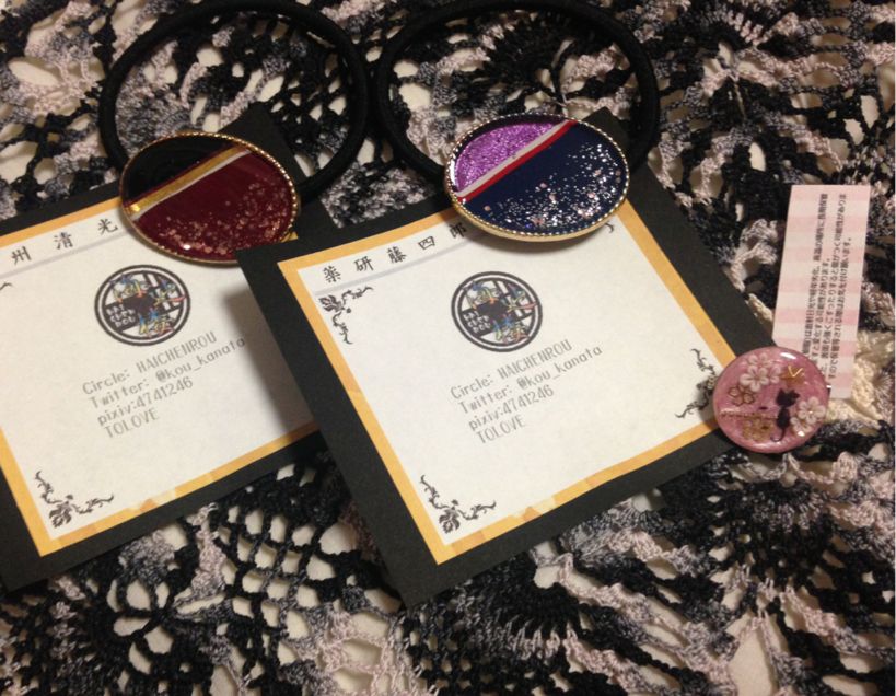 刀剣ヘアゴム(@kou_kanata 様)と猫ちゃんブローチ(@maguta_lxd 様)