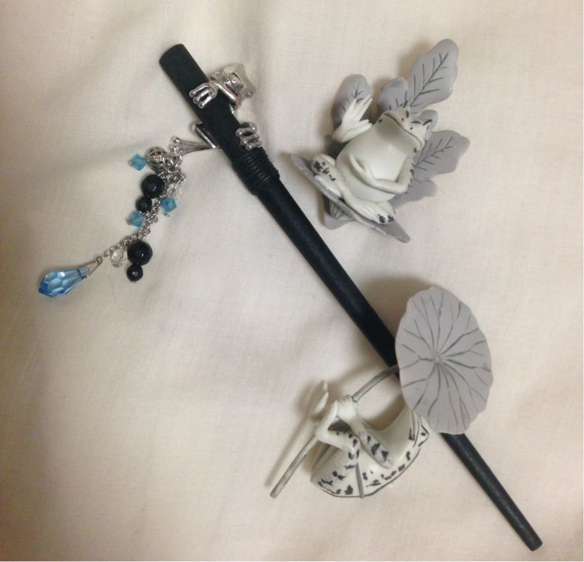 お友達に分けてもらった鳥獣戯画ガチャのカエルさん2匹と、PARCOに入ってるかんざし屋wargoさんのかんざし。