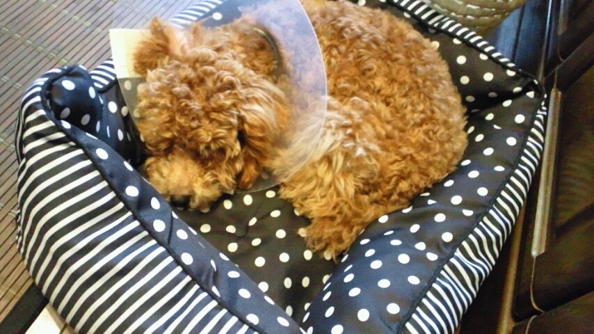 手術自体は、どうって事なかったようですが、やっぱりエリザベスカラーが邪魔で気になるみたい。